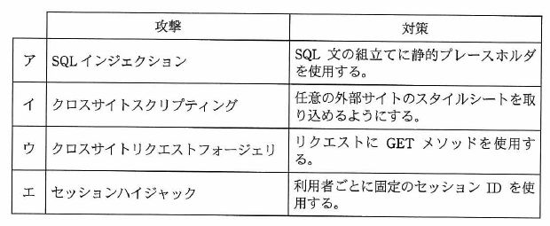 ア | ○ | SQLインジェクション | SQLインジェクション(英: SQL Injection)とは、アプリケーションのセキュリティ上の不備を意図的に利用し、アプリケーションが想定しないSQL文を実行させることにより、データベースシステムを不正に操作する攻撃方法のことである。 静的プレースホルダでは、SQL を準備する段階で SQL 文の構文が確定し、後から SQL 構文が変化することがないため、パラメータの値がリテラルの外にはみ出す現象が起きません。その結果として、SQL インジェクションの脆弱性が生じない。 |