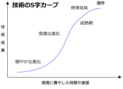 技術のSカーブは、技術の進歩の過程を表すものであり、技術開発当初は緩やかに進歩するが、やがて急激に進歩し、成熟期を迎えると進歩は停滞気味になる。