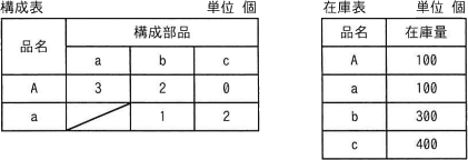 構成表の製品Aを300個出荷しようとするとき,部品bの正味所要量は何個か。ここで,A,a,b,cの在庫量は在庫表のとおりとする。また,他の仕掛残,注文残,引当残などはないものとする。