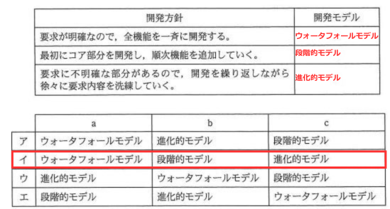 表はシステムへの特性や制約に応じた開発方針と、開発方針に適した開発モデルの組である。 a~cに該当する開発モデルの組合せはどれか。