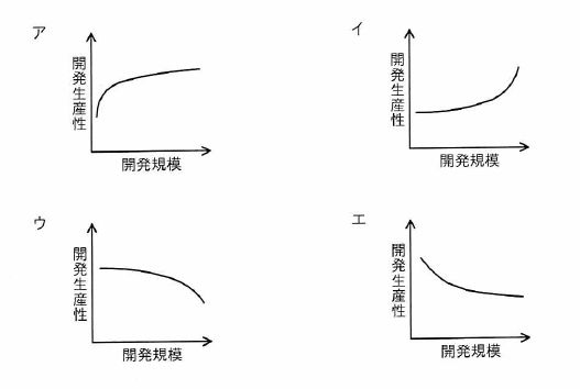 COCOMOには,システム開発の工数を見積もる式の一つとして次式がある。 開発工数=3.0×(開発規模)1.12 この式を基に,開発規模と開発生産性(開発規模/開発工数)の関係を表したグラフはどれか。ここで,開発工数の単位は人月,開発規模の単位はキロ行とする。