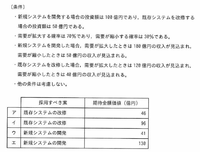 工場の生産能力を増強する方法として,新規システムを開発する案と既存システムを改修する案とを検討している。次の条件で,期待金額価値の高い案を採用するとき,採用すべき案と期待金額価値との組合せのうち,適切なものはどれか。ここで,期待金額価値は,収入と投資額との差で求める。