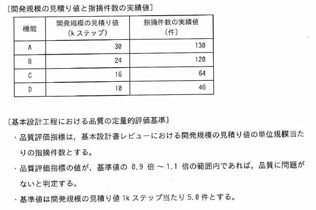 A~Dの機能をもつソフトウェアの基本設計書のレビューを行った。表は,各機能の開発規模の見積り値と基本設計書レビューでの指摘件数の実績値である。基本設計工程における品質の定量的評価基準に従うとき,品質評価指標の視点での品質に問題があると判定される機能の組みはどれか。
