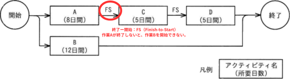 四つのアクティビティA~Dによって実行する開発プロジェクトがある。図は,各アクティビティのPDM(プレシデンスダイアグラム法)における依存関係を表す。条件に従ってアクティビティを実行するとき,この開発プロジェクトの最少所要日数は何日か。 〔アクティビティの依存関係〕