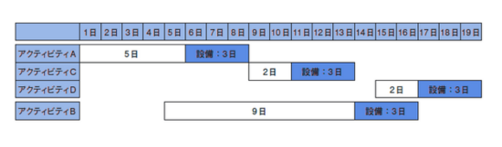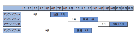 そこで,アクティビティBが設備を使用するタイミングを,アクティビティA,C,Dが設備を使用した後にしてみて,どこで設備を使用すれば最短になるのかを比較して最短日数を求めると、次のようになる。