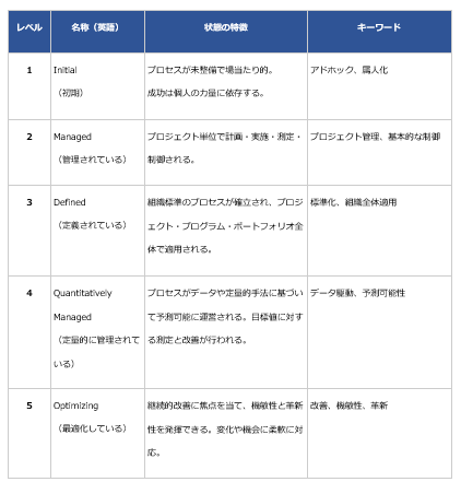CMMIの成熟度レベルは、組織のプロセスの成熟度を5段階に分類している。各レベルの特徴は次のとおりである。