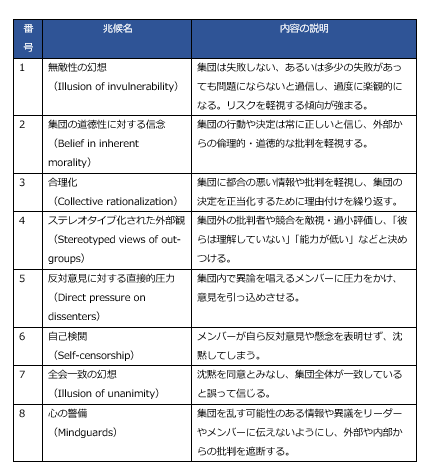 アーヴィング・ジャニスは、集団で意思決定を行う際に陥りやすい問題点として 「集団思考」 を提唱した。その中で、集団思考が起きている兆候を8つ指摘している。